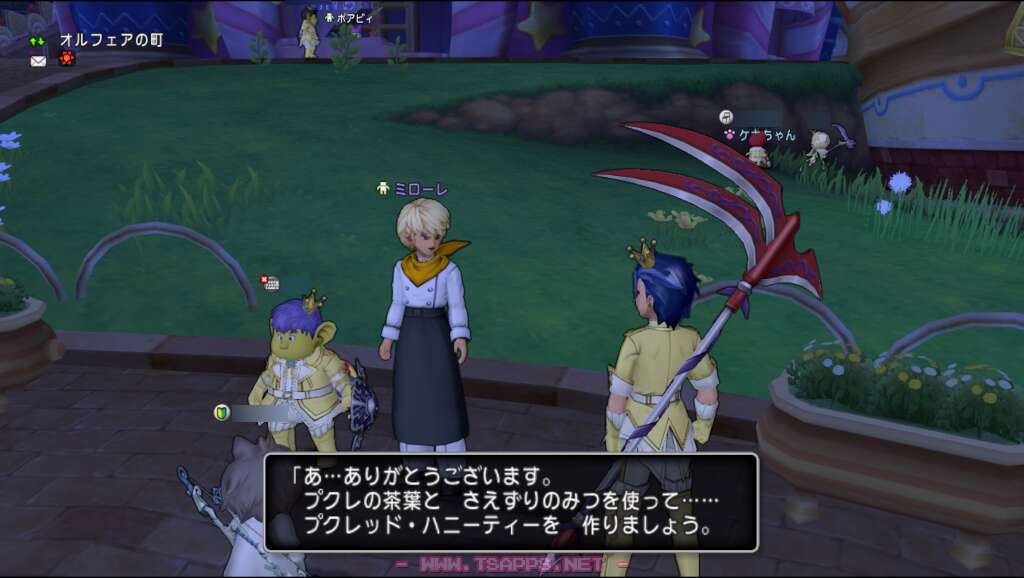ミローレにプクレの茶葉を渡すと、あっという間にプクレッド・ハニーティーを作って、ノドの痛みを治すことができました♪