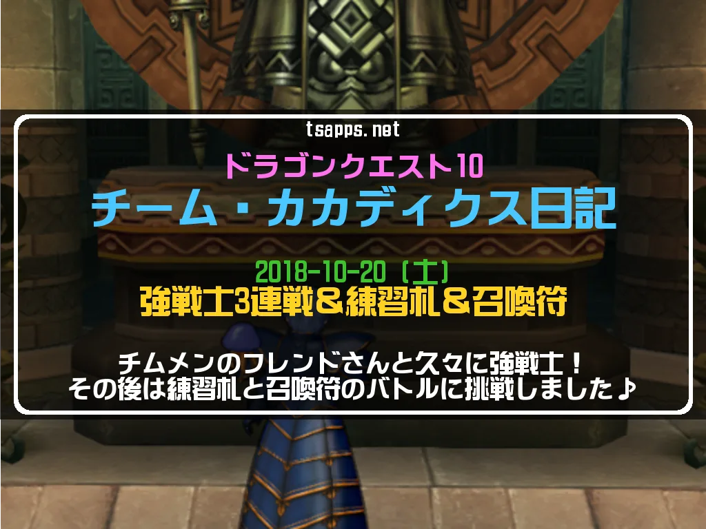 【ドラクエ10】チーム・カカディクス日記≪2018-10-20≫フレンドさんと久しぶりに強戦士3連戦&練習札&召喚符バトルに挑戦!