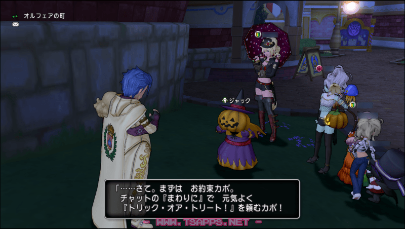 グレン・ガタラ・オルフェア・アズラン・ジュレットにいる「ジャック」に話しかけると、チャットで元気よくあの言葉を!と頼まれるので、毎年恒例の『トリック・オア・トリート!』と叫びます🎃