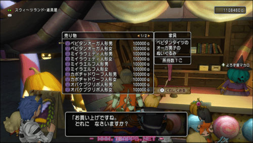 スウィ~ツランドの東側にある、ぬいぐるみ屋さん。こちらでは最初に貰うことが出来た種族人形の他種族バージョンを買うことができます。