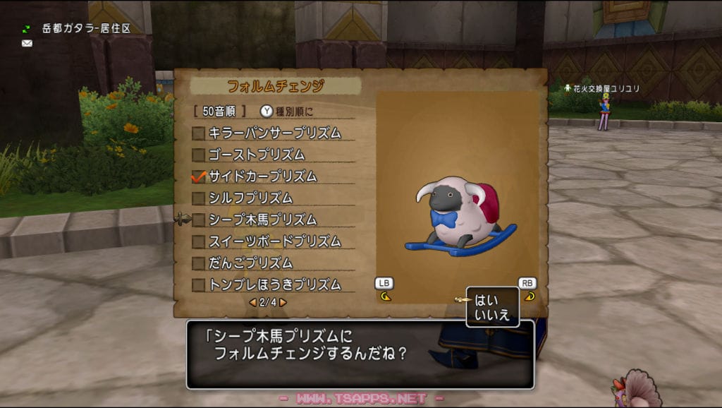 続いて移動したのは岳都ガタラの広場。カスタム屋デコリーに頼んで、シープ木馬プリズムを取り付けてもらいました☆