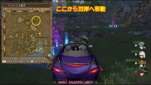 次に向かうのが丸で囲った転送ポイントの場所。前もってティプローネ高地側から転送装置を使えるようにしておいてくださいね。この装置で対岸へ移動します。