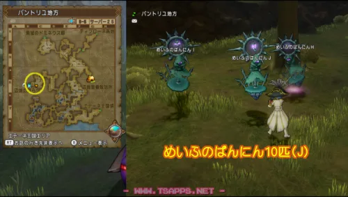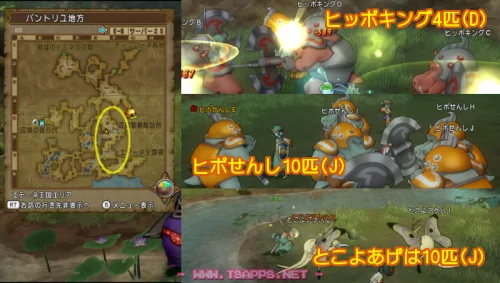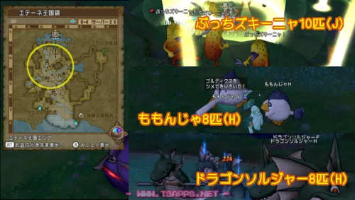王都キィンベルの南側、丸で囲った広範囲のエリアにターゲットの3種類がウロウロしています。川の近くにももんじゃ、ぶっちズキーニャとドラゴンソルジャーはその周辺といった感じ。