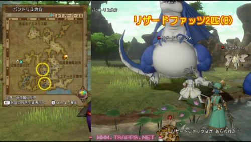 ラストターゲットはリザードファッツ2匹。先ほどの場所から遠くない、丸で囲った2ヶ所にいます。大きいのですぐ見つけられますね。