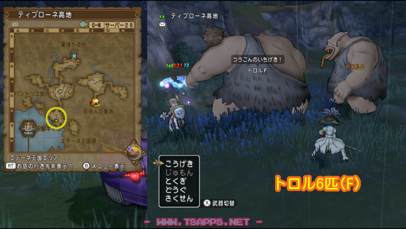まずはトロル6匹の討伐からスタート!ここまで来れる強さのキャラなら楽勝のモンスターですね♪まもの使いのエモノ呼びか遊び人のくちぶえを使って、短時間で効率良くいきましょう!