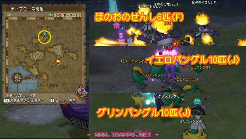 ほのおのせんし6匹、イエロバングル10匹、グリンバングル10匹をバッタバッタと倒していきましょう!