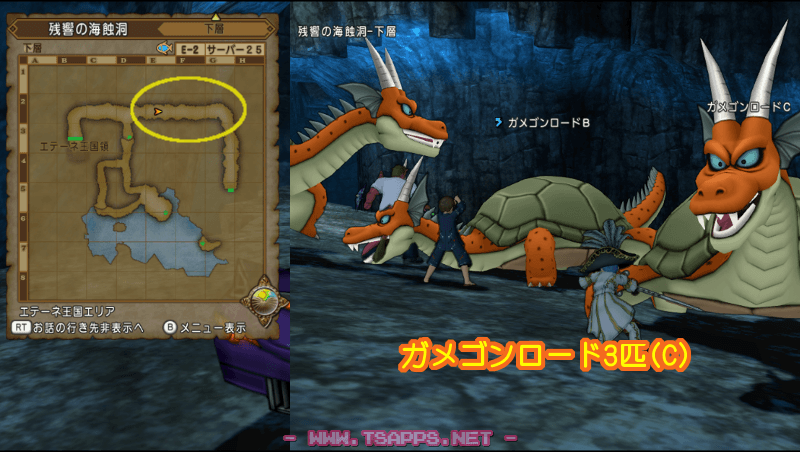 洞窟へ入ったら分岐を無視して真っ直ぐ道なりに進めば、すぐに最初のターゲットであるガメゴンロードが登場。たった3匹倒すだけで完了です。