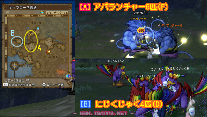 そこでアバランチャー6匹を倒したら、今度はマップ中央部から西方向にあるエリアBへ移動。次のターゲットであるにじくじゃく4匹を倒します。
