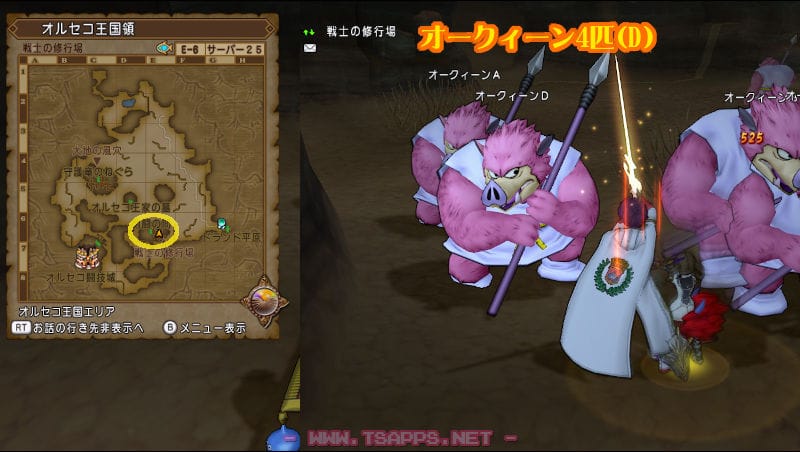 次は最初のエリアから少し南西にある洞窟「戦士の修行場」内にいるオークィーン4匹がターゲット。こちらも苦戦することなく倒せますね!