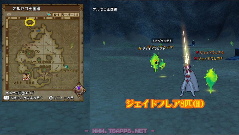 ジェイドフレア8匹は墓地のあるマップC-1で登場します。簡単に倒せる敵ではありますが、ここに行くのは距離があって面倒!てなわけでここを最後に設定しました。