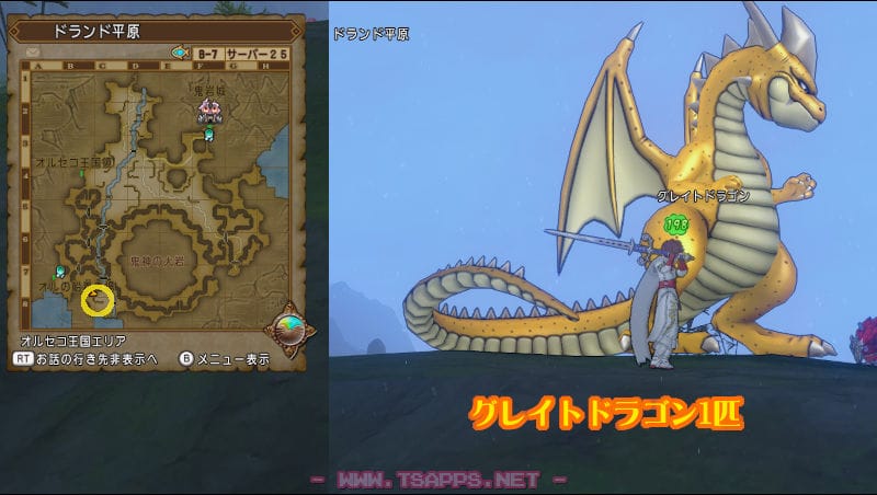 次のターゲットは到着地から東へ少し移動した高台。巨大なグレイトドラゴンの姿が見えてくるはずです。1匹倒せばOKなので、集中攻撃でサクッと倒しましょう。残るターゲットは1種類!