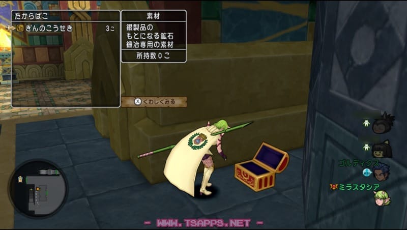 ドルワーム水晶宮にやってきました。1階にある神カラクリを使って4階へ移動!目的地の上層へ移動する前に、裏側の細い通路に置いてある宝箱から「ぎんのこうせき」をゲット☆
