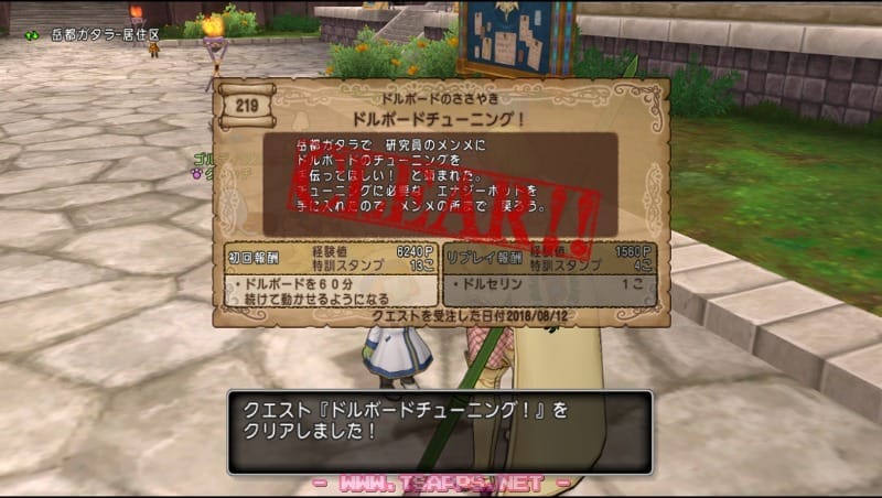 このクエストをクリアしたことで、60分連続でドルボードを使えるようになりました。長旅には必須の改良ですね。これでまた少し旅を進めるのが楽になりました。