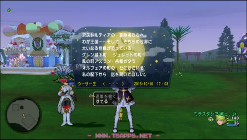 今回のテンの日に合わせて始まったイベントは「カムバックお月様!」。ウーサー王から届いた手紙によれば、グレン・ジュレット・アズラン・ガタラ・オルフェアのどこかにいる、王の配下から話を聞いてほしいとのこと。
