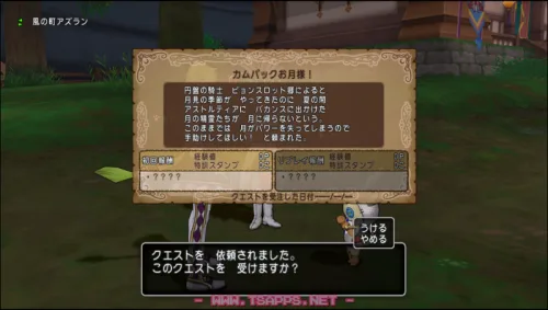 アズラン住宅村から出発したのでアズランにいる配下のもとへ。ピョンスロット卿が待っているので話しかけると、夏の間にアストルティアへバカンスに出かけた月の精霊たちが帰ってこない影響で、月がパワーを失ってしまうから助けてほしいと頼まれます。