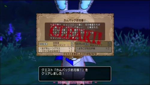 ピョンスロット卿の所へ戻って報告すればクエストはクリアとなります。報酬は「なげきムーングラス」と「ウサぐるみ衣装券II」、そして「お月見だんご100個」でした♪