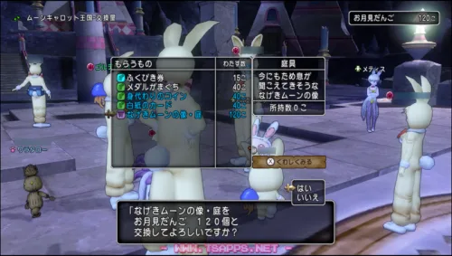 再びムーンキャロット王国へ移動し、交換屋さんに話しかけてアイテムをもらいます。5個あるうちの4個は他でも手に入る物なので、限定品の「なげきムーンの像・庭」をゲットしました♪