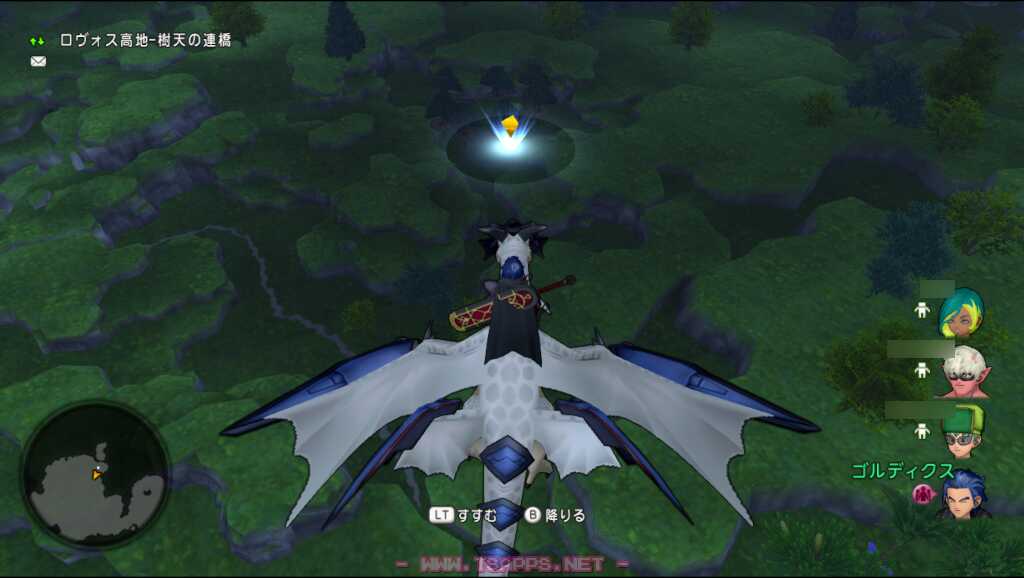 グランゼドーラから飛竜に乗って南へ少し移動。ロヴォス高地上空から樹天の連橋を着地点に合わせます。これでエリミネーター生息地に到着!