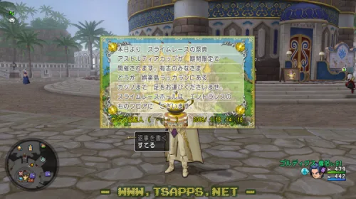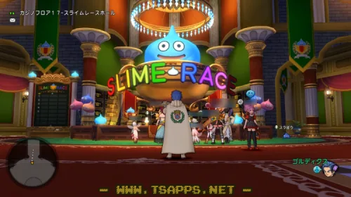 エントランスの右側、アイテム交換所などのそばにある扉から、スライムレースホールに入ります。この日は初日だったこともあり、かなりの数のサーバーが混雑状態でした。