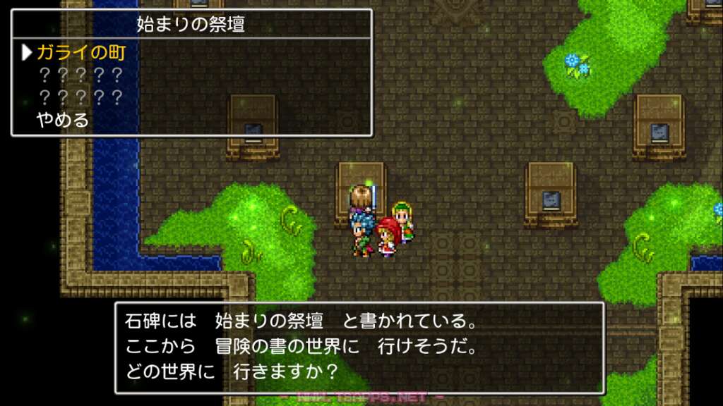 置いてある冒険の書を調べると選択肢。最初なので選べるのは「ガライの町」だけですね。