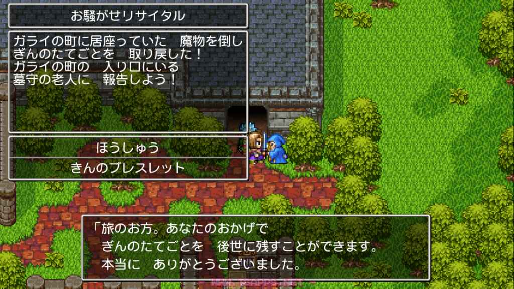 長老の所まで戻って「ぎんのたてごと」を渡せば、ガライの町のクエストはクリア!
