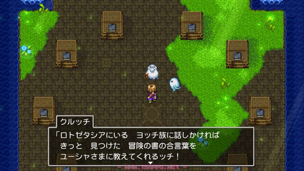 ここでクルッチが見つけたという合言葉を教えてもらい、始まりの祭壇にある冒険の書の世界・ガライの町へと行けるようになりました。