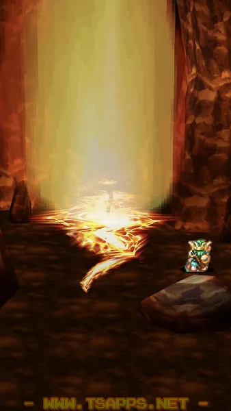 やがて左の写真の場所に到着します。確かに山道を岩が塞いでいますね。ここに触れると画面が切り替わるので、奥まで進んでマグマの杖をセット!