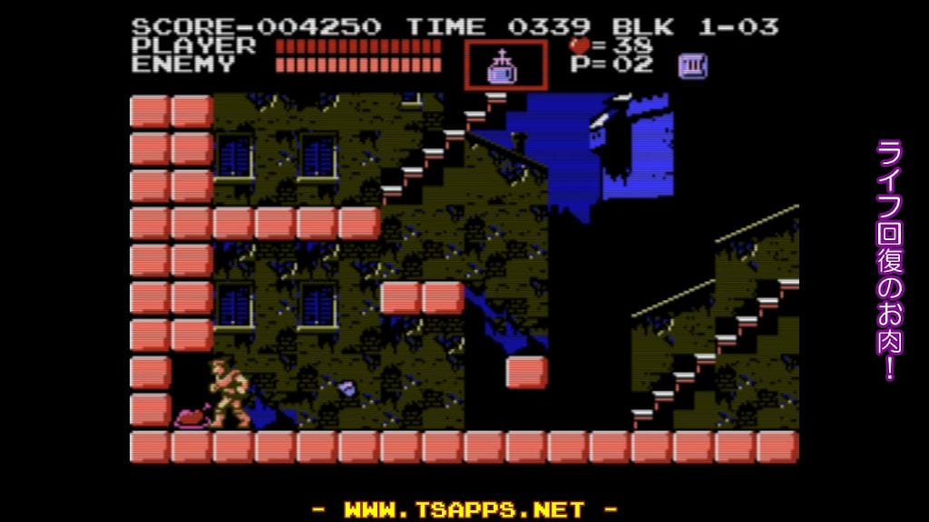 ブロックを壊すと現れるそのお肉を食べると、ライフゲージが8目盛り回復します。
