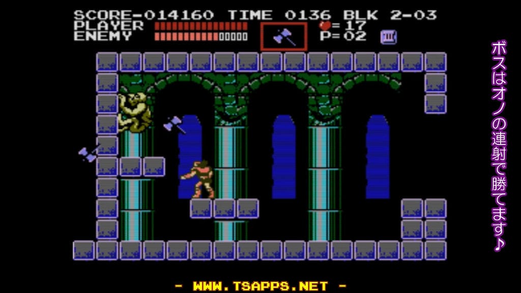 ステージ2のボスは、壁を上って天井から攻撃したりしてくるので、写真の位置からオノを投げまくっていれば勝手に当たって自滅してくれます😄