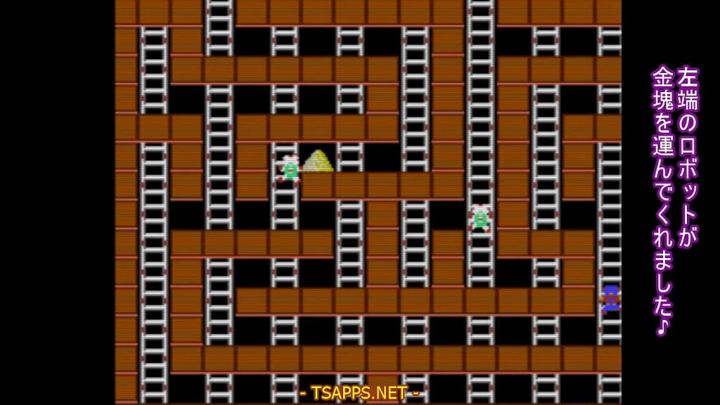 金塊の反対側の通路へ行けばロボットが金塊を持ってくれるので、あとは上の方までうまく誘導。金塊を落としてくれたところで奪って脱出です♪