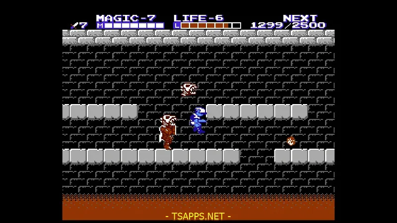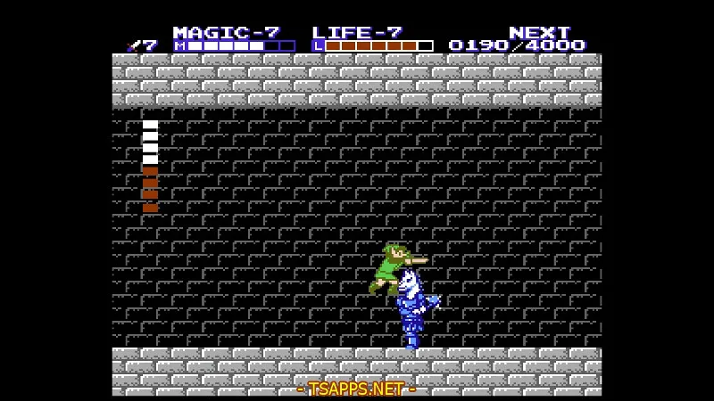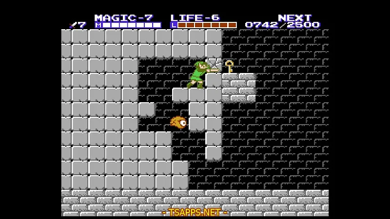 この神殿はこれまでに覚えた魔法やテクニックを駆使する場面が多いです。中へ入って2画面目では、いきなりジャンプで越えられない壁!