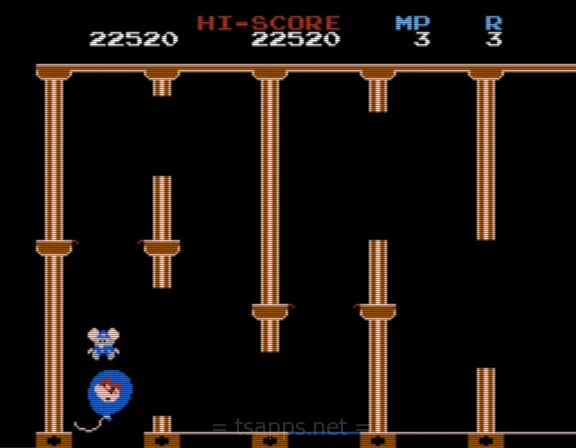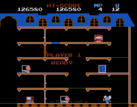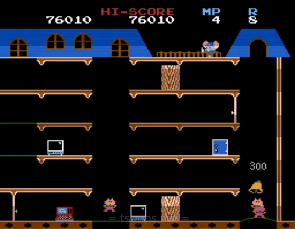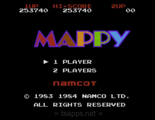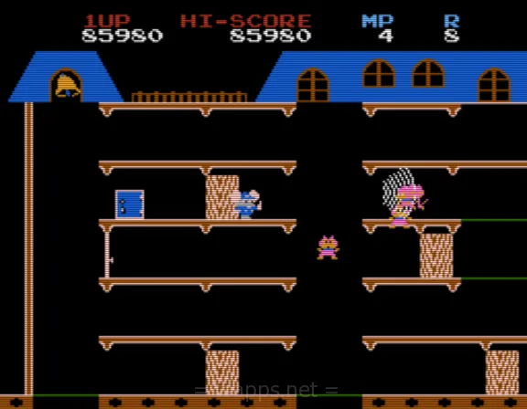 ナムコから1984年に発売されたROMカセット「マッピー」は、ネズミの警官マッピーを操作して、ニャームコ軍団に盗まれた物を取り返していく、というアクションゲーム。
