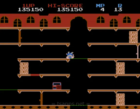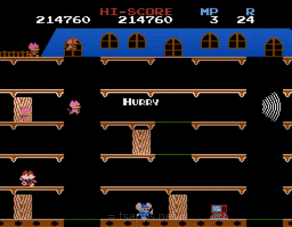 ここからの3ステージでは、床が光っている場所が存在します。ここをマッピーが通過すると、一定時間穴が開いて、敵を落とすことができます。うまく足止めとして利用しましょう♪