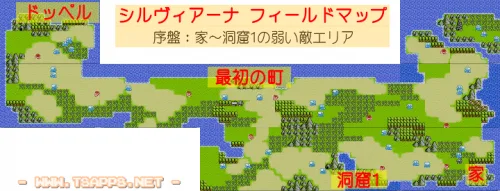 流れとしては、家を出発してマップ中央にある最初の町まで向かいます。その後ドッペルの洞窟、洞窟1と続いていきますが、今回の記事ではドッペルの洞窟までを攻略したいと思います。