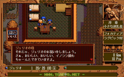 ここまでは前回紹介した場所と同じでしたね。次回からはいよいよフィールドに出て長旅が始まりますよ。画面を見てもらえればわかりますが、ストーリーは章構成となっています。
