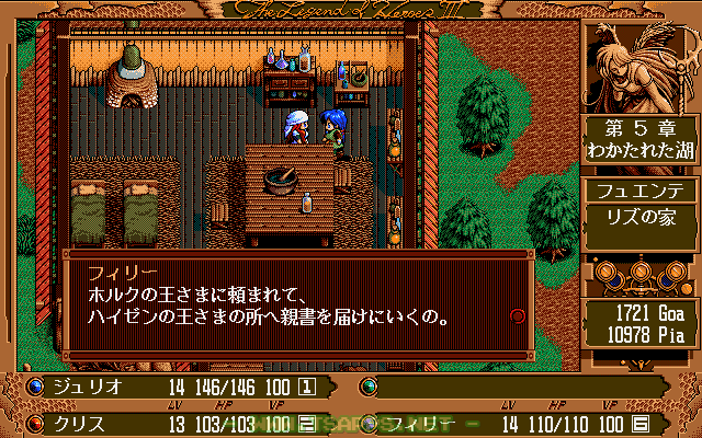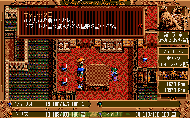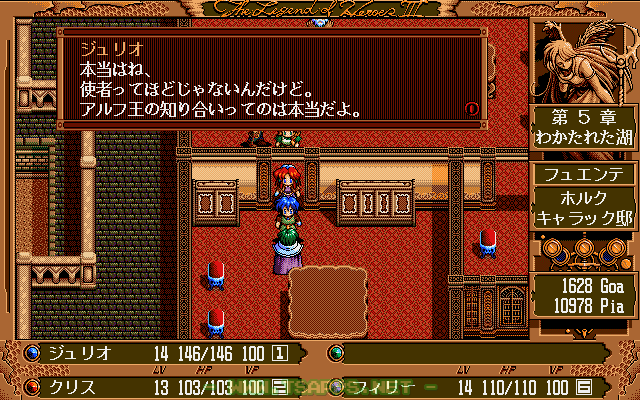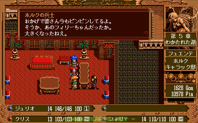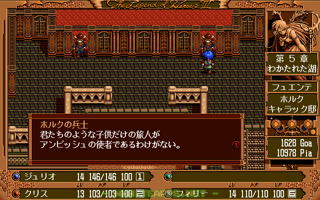 PC-9801シリーズ用RPG「英雄伝説III 白き魔女」徹底プレイ日記!フュエンテの副都・ホルクの王様が住む邸宅へとやって来たジュリオたち。しかし入口を塞ぐ兵士たちが中へ入れてくれません。