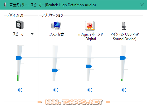 ウィンドウの下の方に少し見えているスピーカーは、元々使っているマザーボードのサウンド機能のもので、既定のスピーカーです。