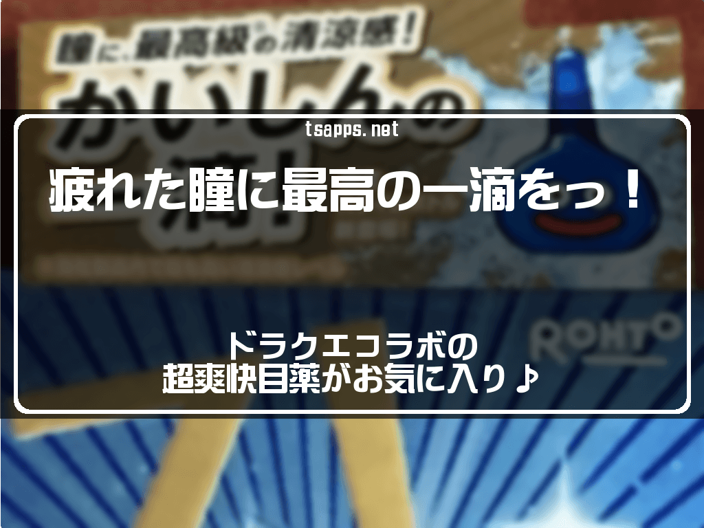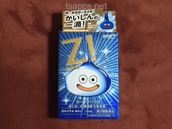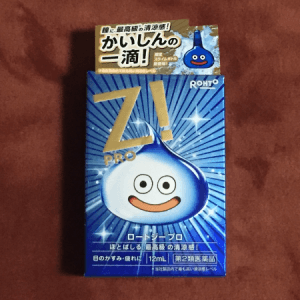 ロートから発売されている「ロートジープロ」とドラクエのコラボ企画で生まれた、限定スライムボトルのバージョンです。外箱もスライムデザインでかわいらしいですね。裏面の清涼感レベルを見てみると、今まで見たことのないレベル8+!その刺激に最初は驚きました。ですがその爽快感がたまりません!まさに「かいしんの一滴!」といった感じで、ガツンと強烈な一撃を喰らったような効き目です。もちろん効能もしっかりしていて、説明文にはピント調節機能の回復、ビタミン補給、細胞呼吸の促進とあります。歳のせいか最近ピント調節が弱ってきた感じもするので、こういった目薬を利用したり、サプリメントでブルーベリーを飲んだりしています。
